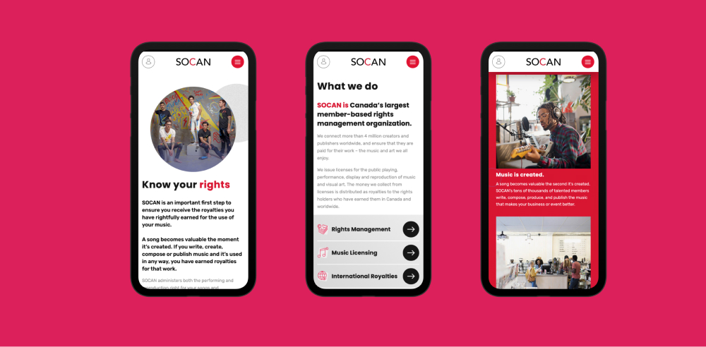 Technology is a driving force behind SOCAN’s success, and with the launch of its new website we helped build on that image. Not only does it integrate several important business functions, it provides a modern online experience that caters to the needs of music creators and businesses that use music.
